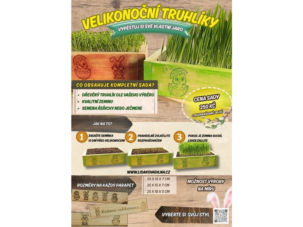 Líšákova velikonoční sada: Tradice v poctivém dřevě Představujeme vám naši novou kolekci designových velikonočních truhlíků. Jsou navrženy tak, aby přinesly svěží zelené jaro do vašeho domova a staly se perfektní dekorací na sváteční stůl.